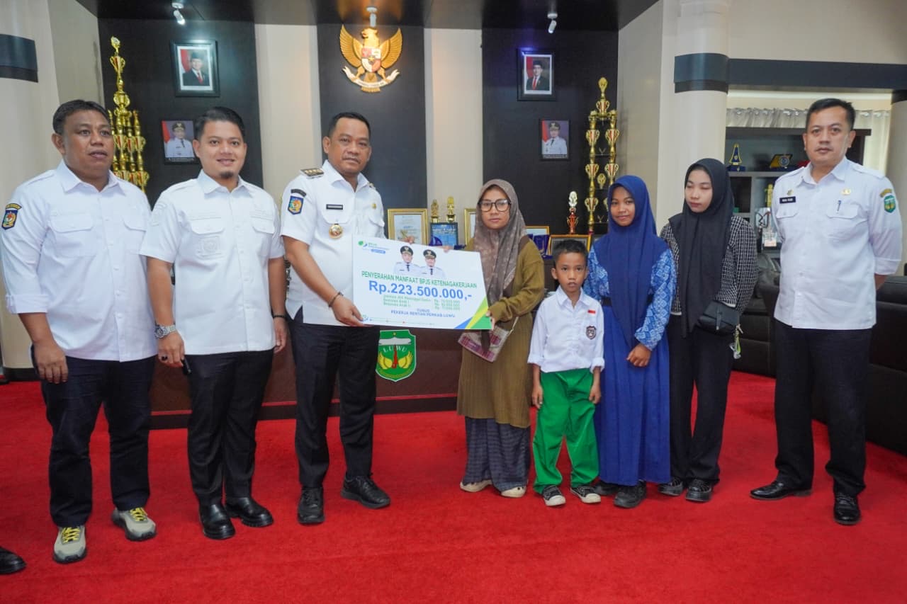 LAGALIGOPOS.COM – Bupati Luwu, Patahudding, menyerahkan santunan kecelakaan kerja kepada keluarga almarhum Yunus di ruang kerja Bupati Luwu, Rabu (22/4/2026). Total santunan yang diberikan mencapai Rp223.500.000 yang terdiri dari santunan kematian serta beasiswa bagi anak almarhum.